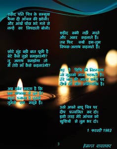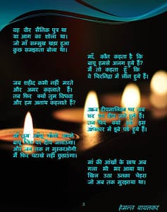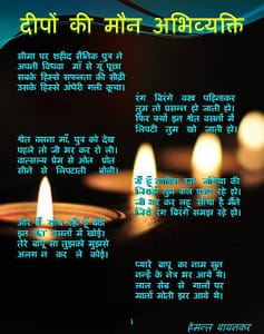 आज से हम सबके घर-आँगन प्रकाशोत्सव दीपावली पर्व के पावन अवसर पर जगमगाने लगे हैं। किन्तु, ऐसे भी कुछ घर-आँगन हैं जो उनकी बाट जोह रहे हैं जो सीमा पर शहीद हो गए हैं और कभी लौट के नहीं आएंगे। उन समस्त परिवारों को नमन एवं वीरों को श्रद्धा सुमन अर्पित करते हुए मेरे काव्य संग्रह “शब्द ….. और कविता” में प्रकाशित एक कविता “दीपों की मौन अभिव्यक्ति”।